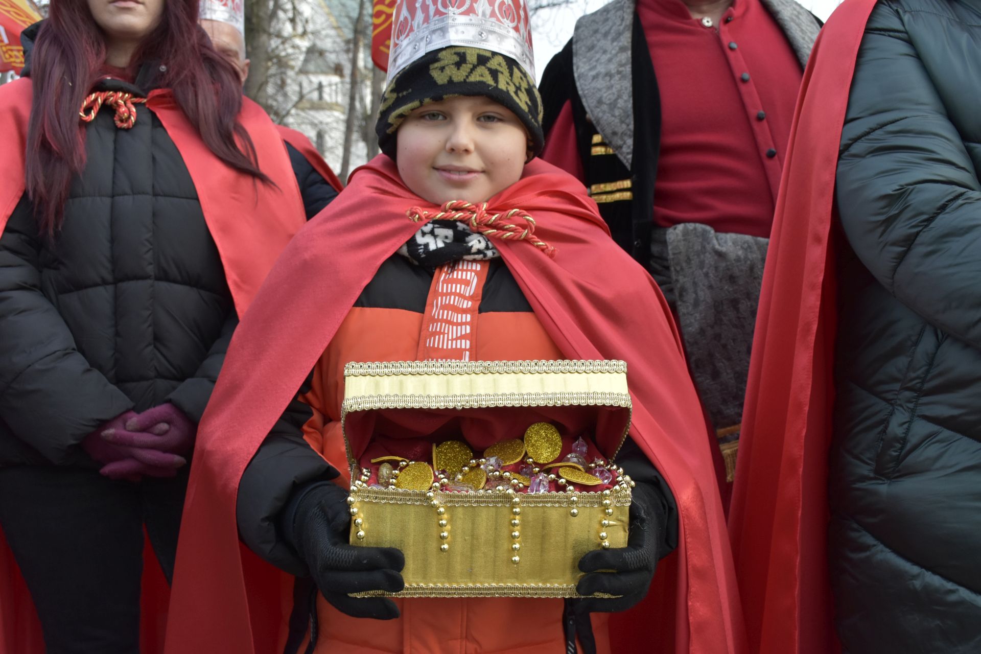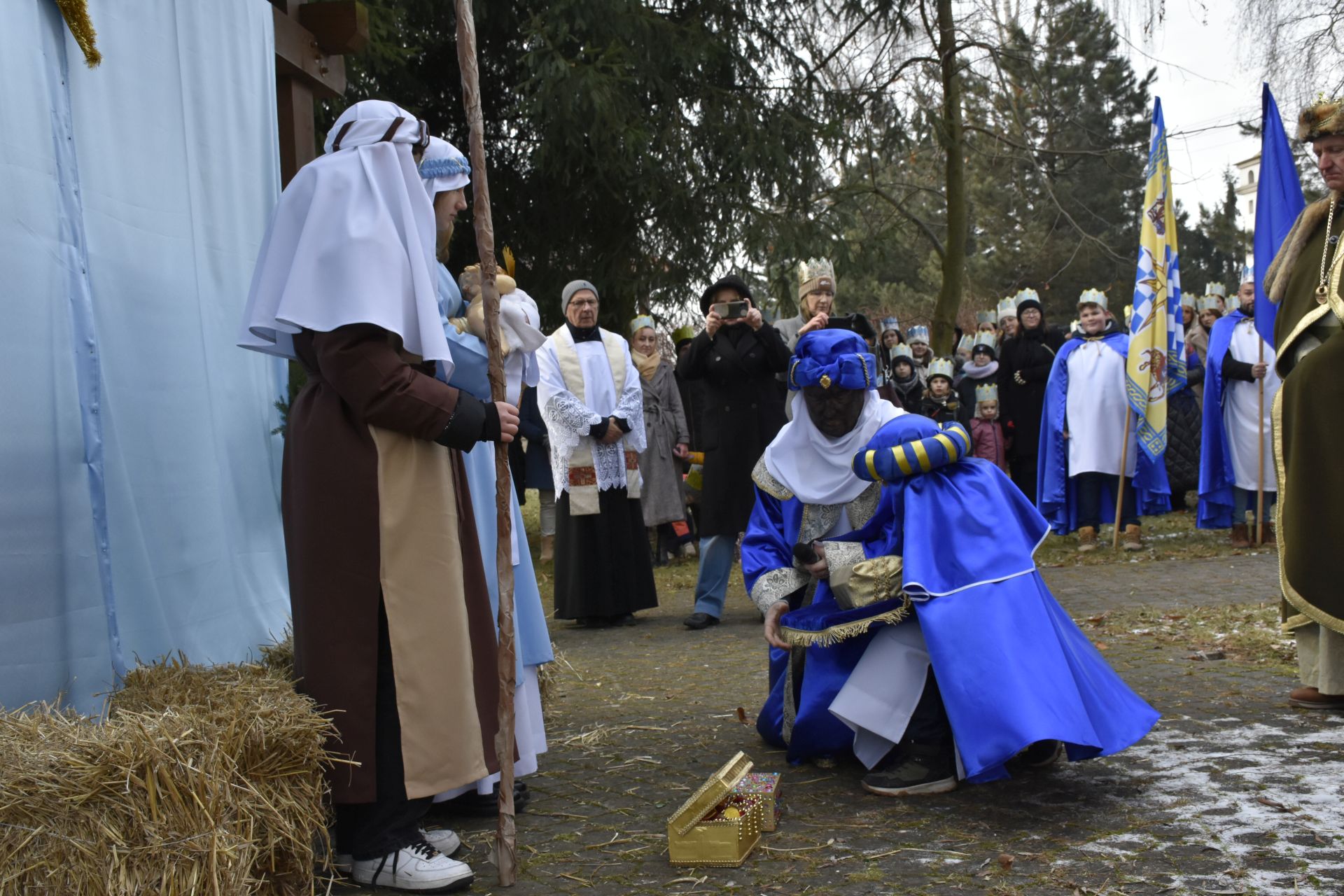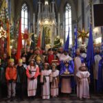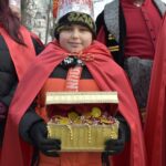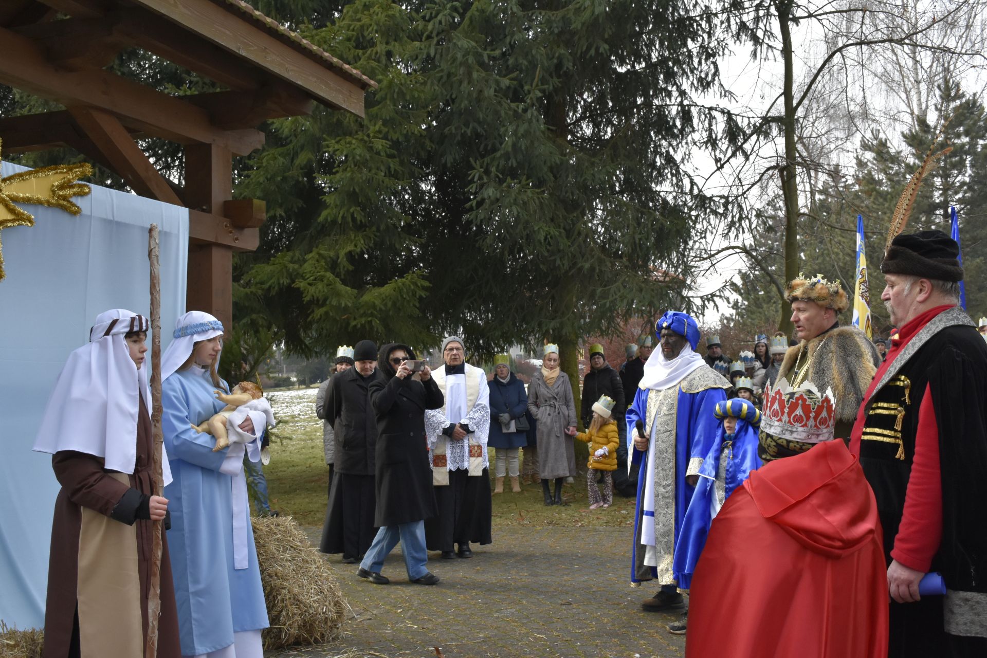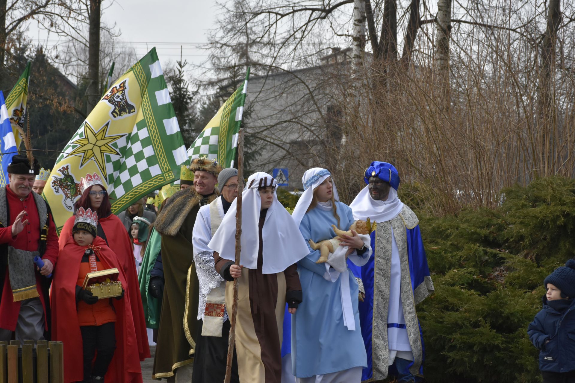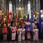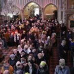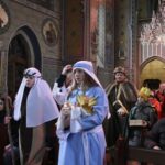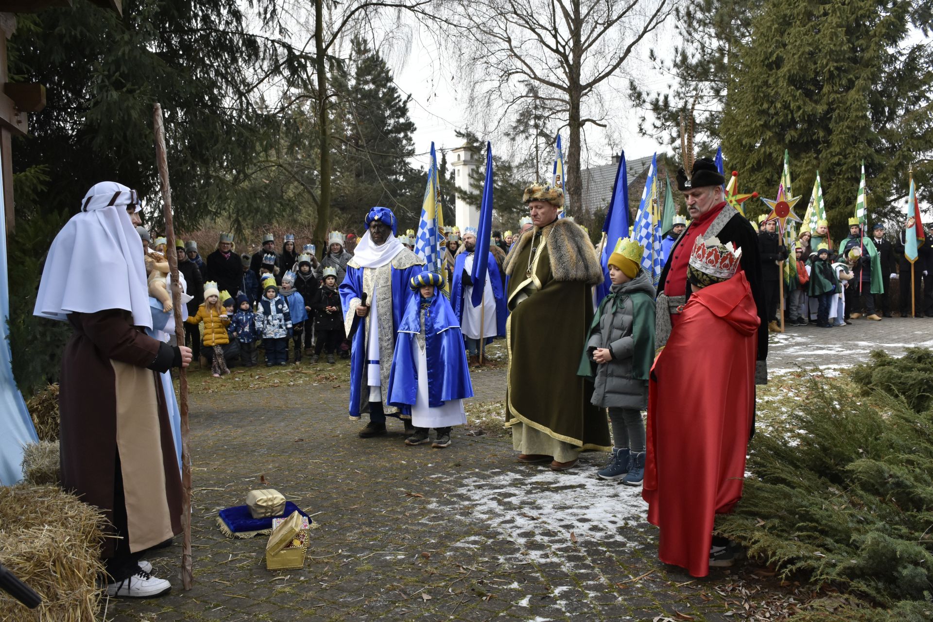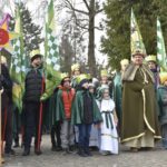 Trzy części Orszaku w trzech kolorach – niebieskim, czerwonym i zielonym spotkały się około godziny 11.00 na rynku przed kościołem, aby złożyć dary Dzieciątku w szopce, a następnie przejść do kościoła na Mszę Świętą o 11.15.