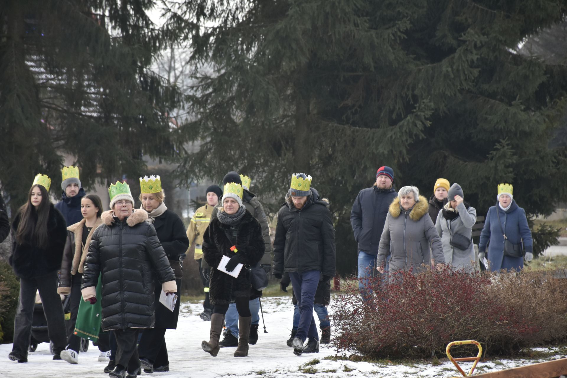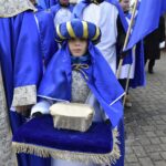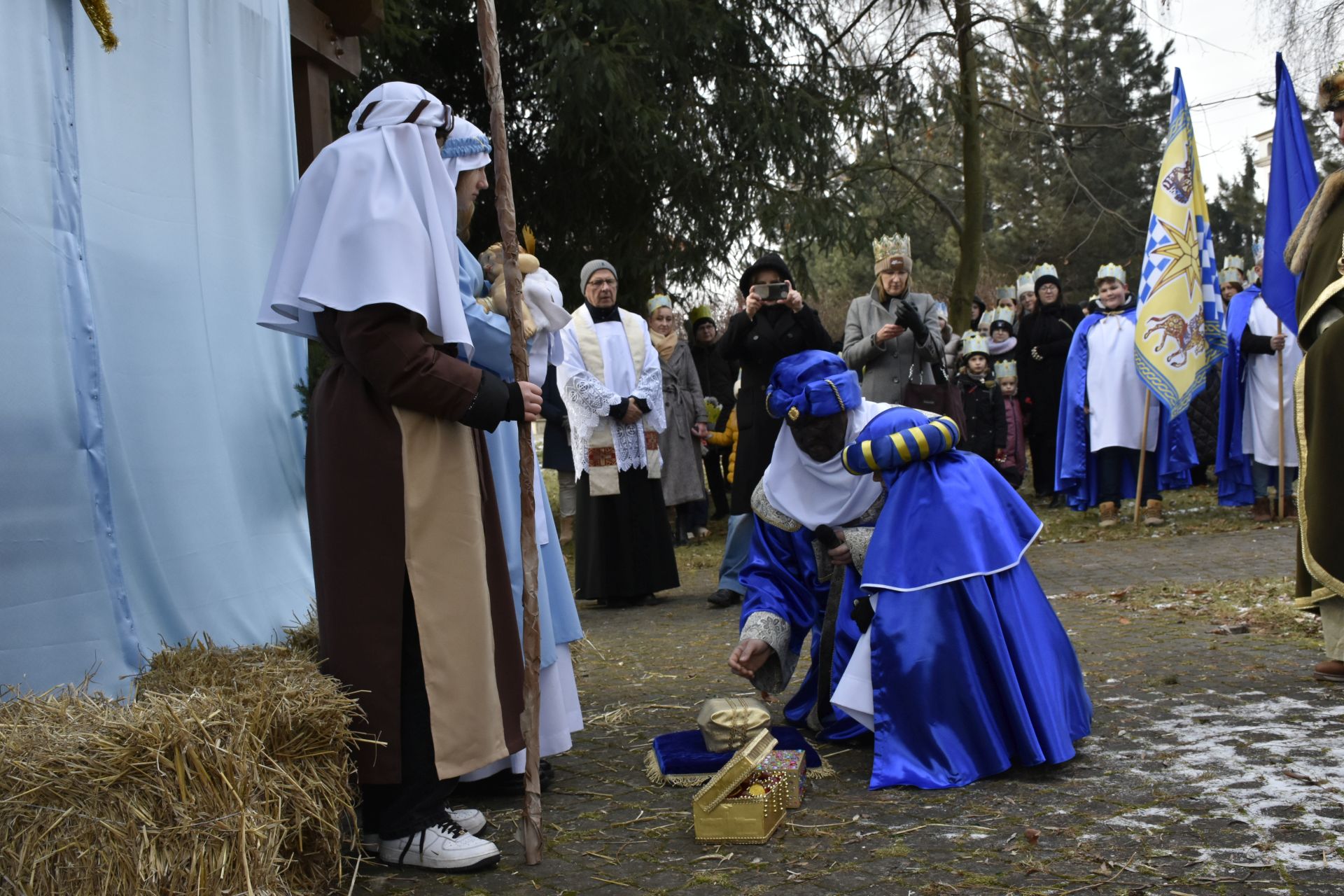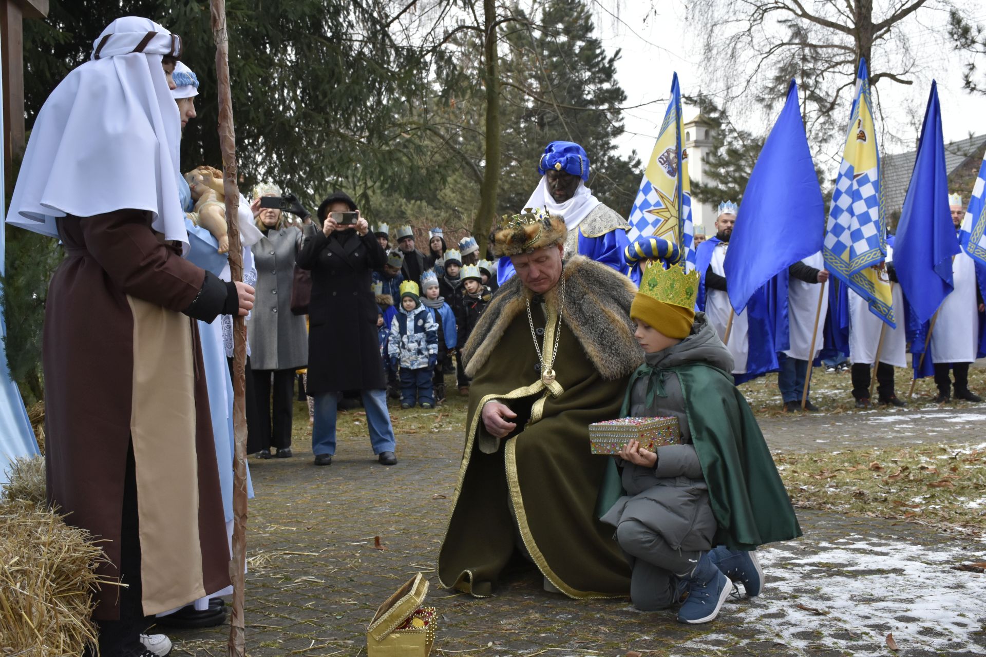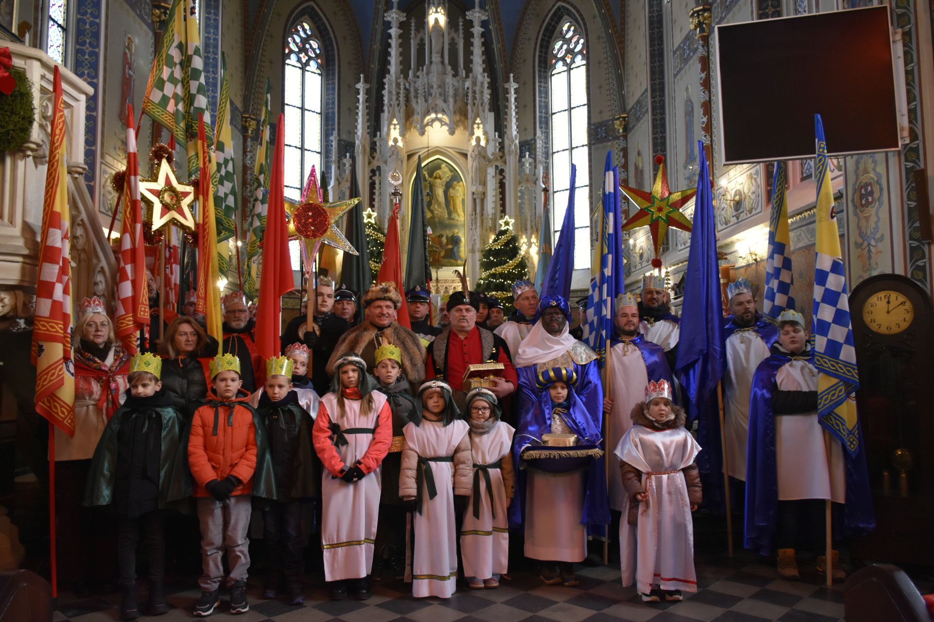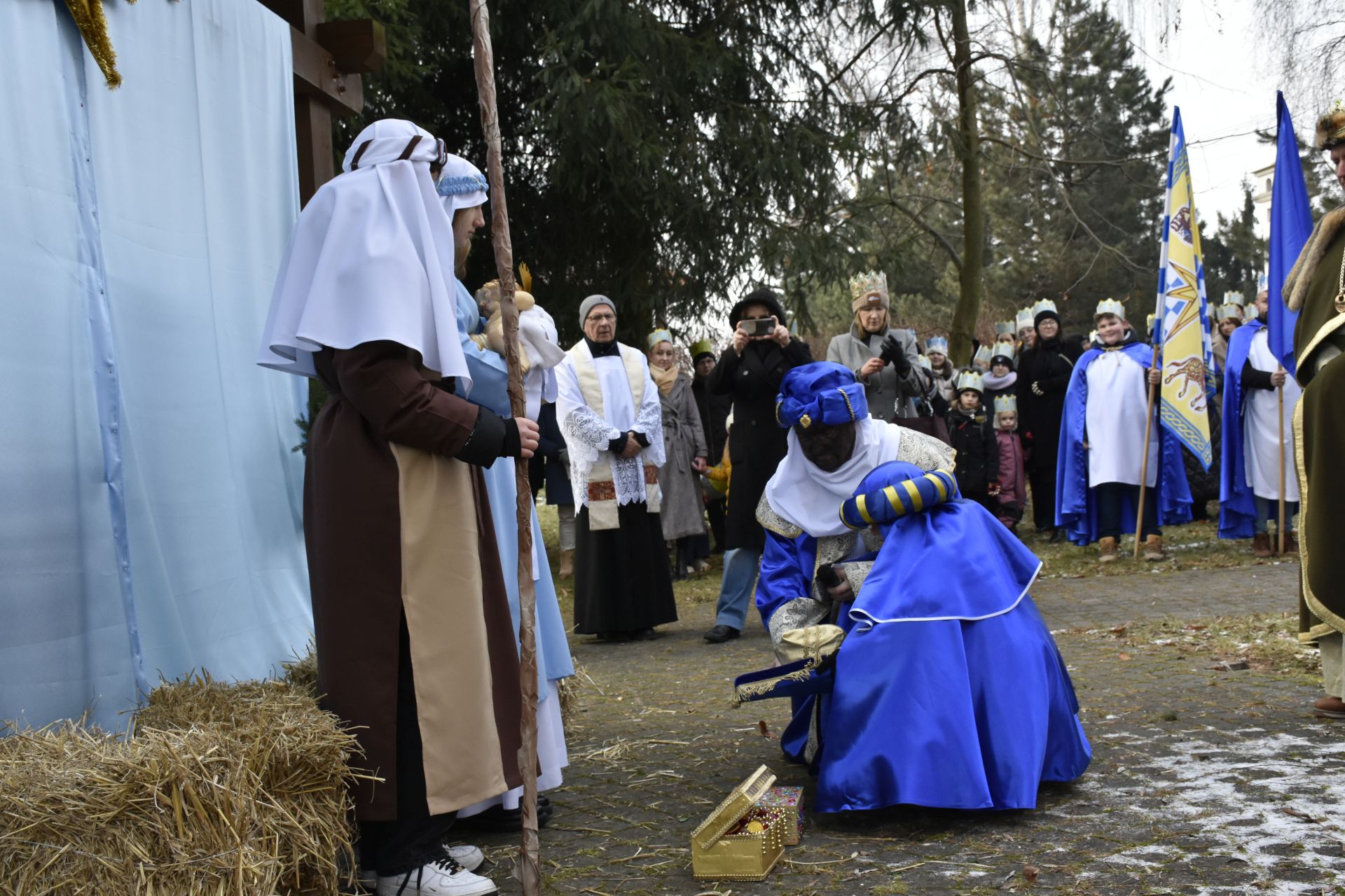 Trzy części Orszaku w trzech kolorach – niebieskim, czerwonym i zielonym spotkały się około godziny 11.00 na rynku przed kościołem, aby złożyć dary Dzieciątku w szopce, a następnie przejść do kościoła na Mszę Świętą o 11.15.