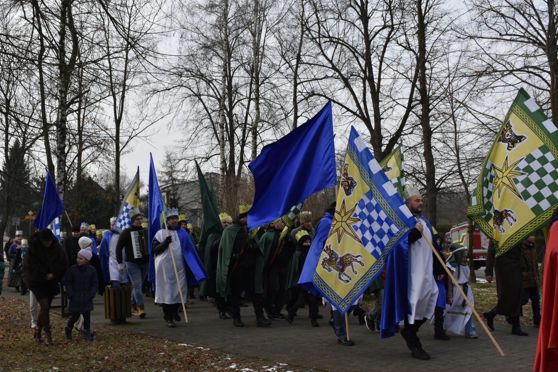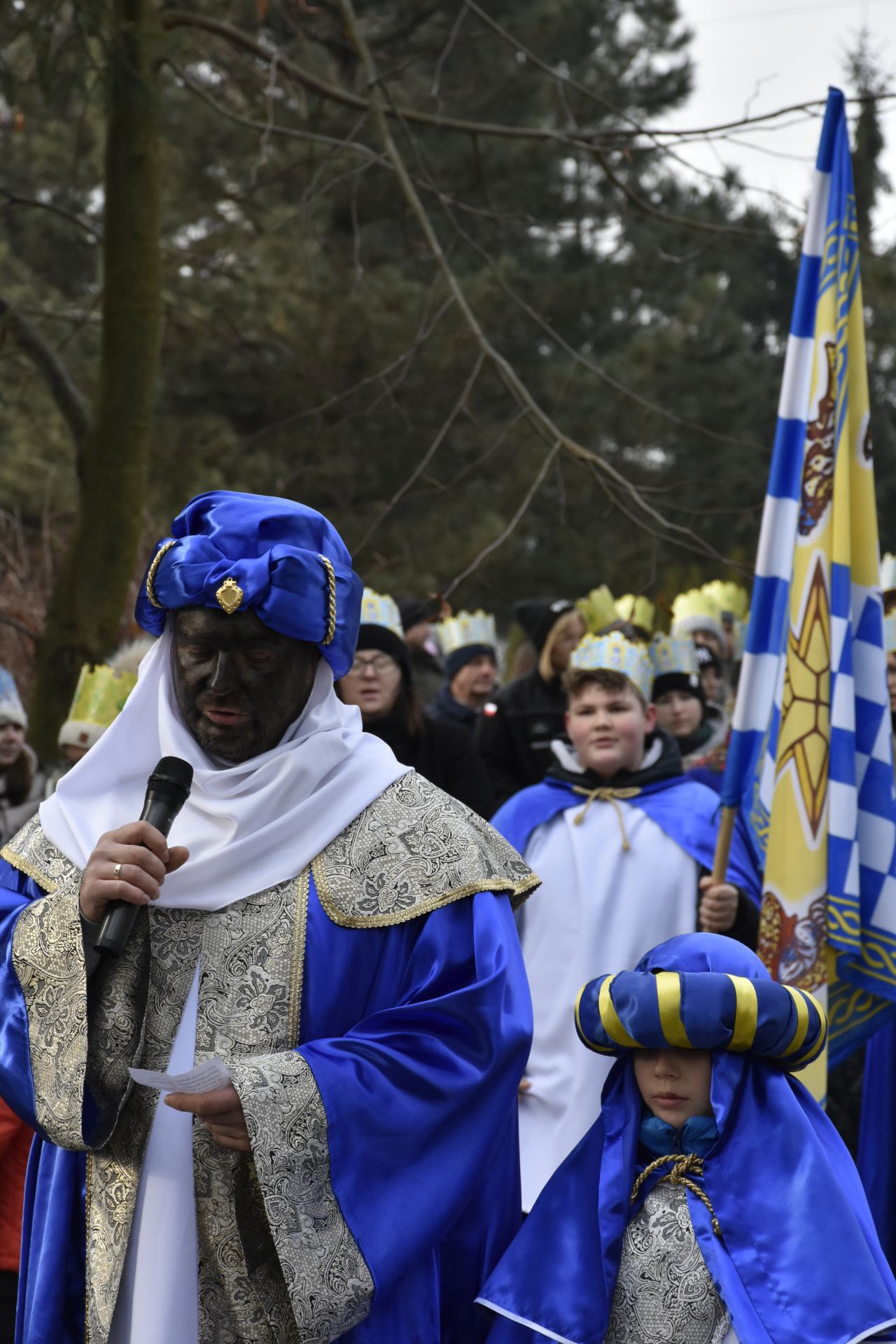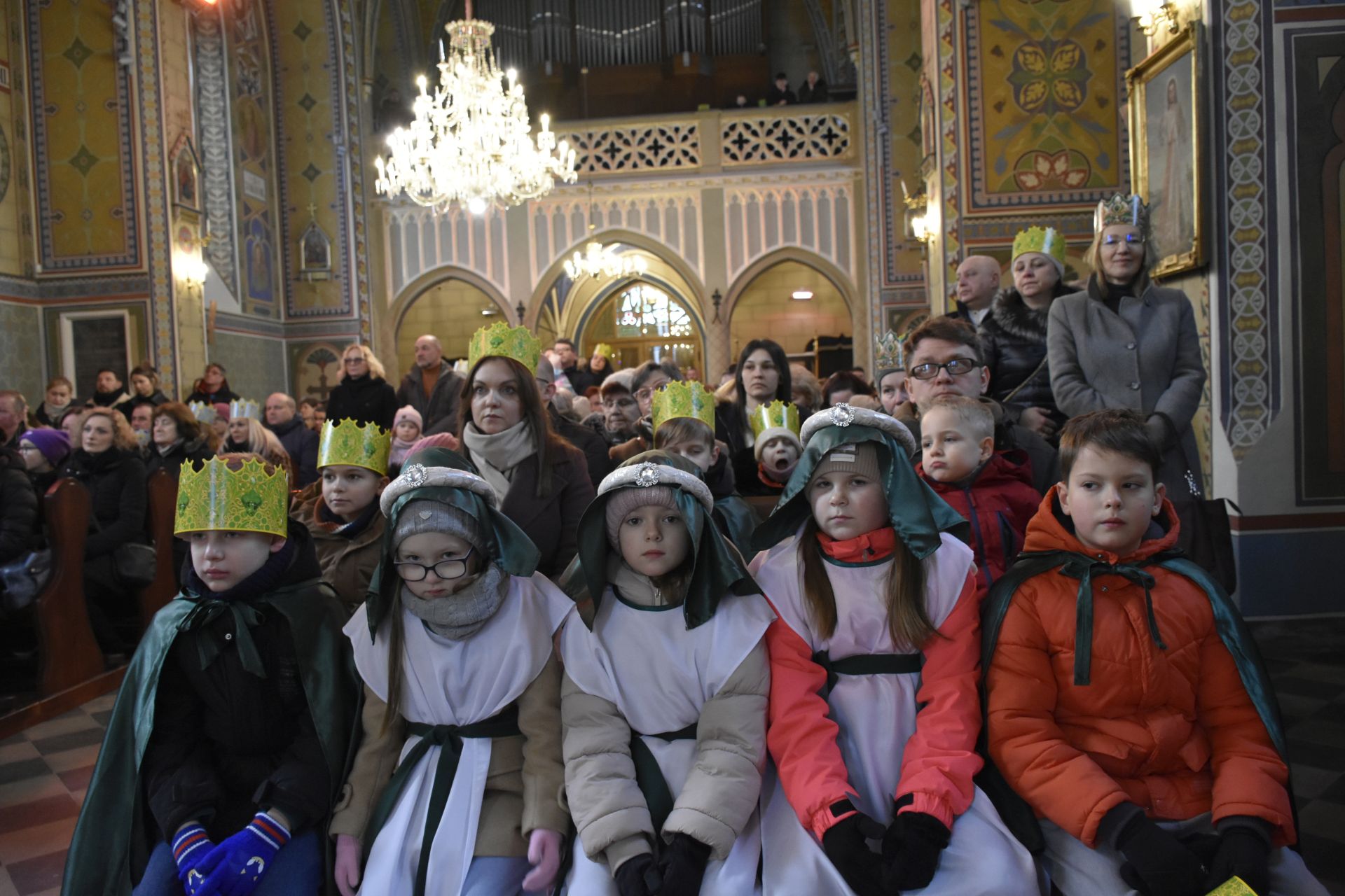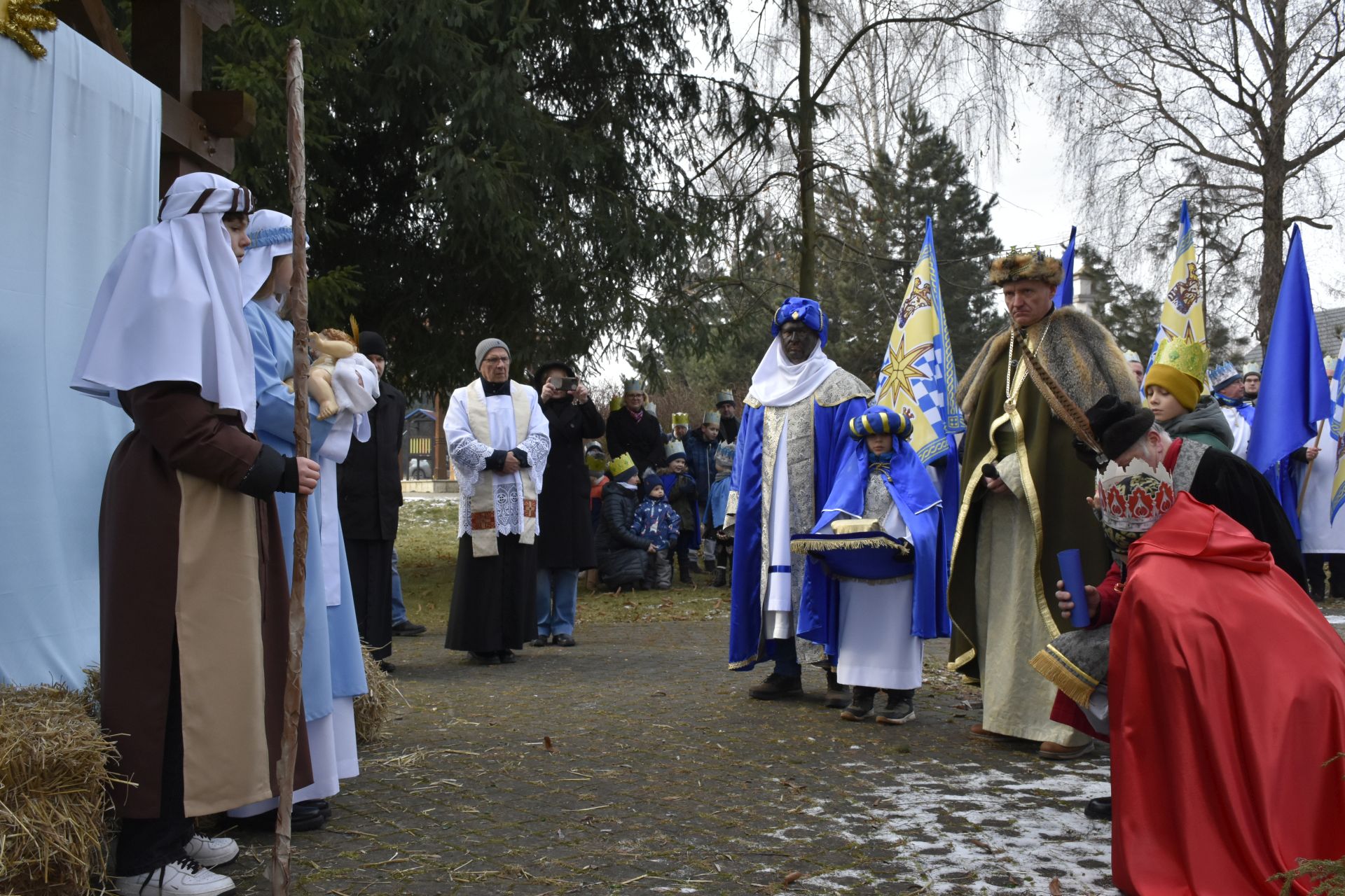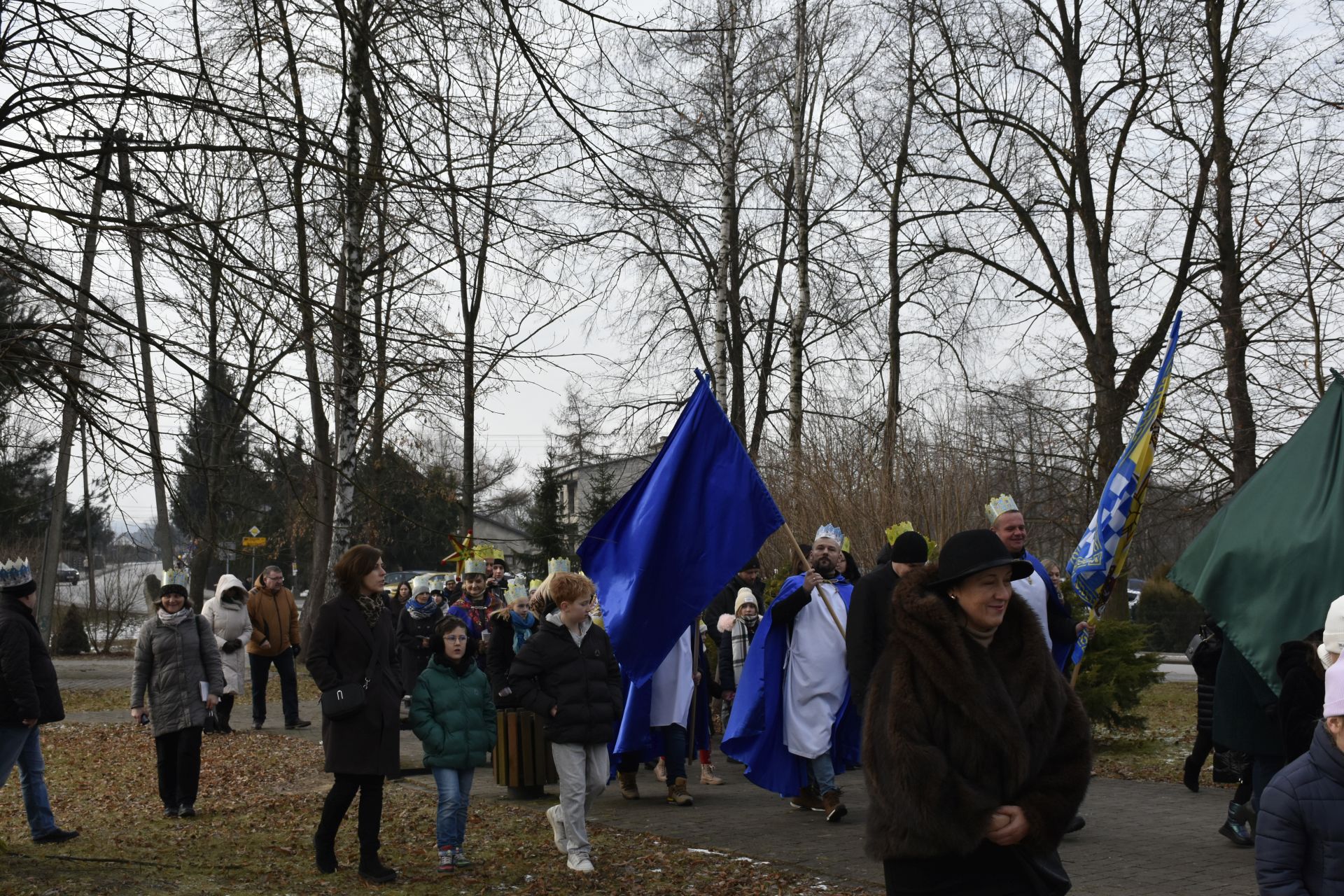 Trzy części Orszaku w trzech kolorach – niebieskim, czerwonym i zielonym spotkały się około godziny 11.00 na rynku przed kościołem, aby złożyć dary Dzieciątku w szopce, a następnie przejść do kościoła na Mszę Świętą o 11.15.