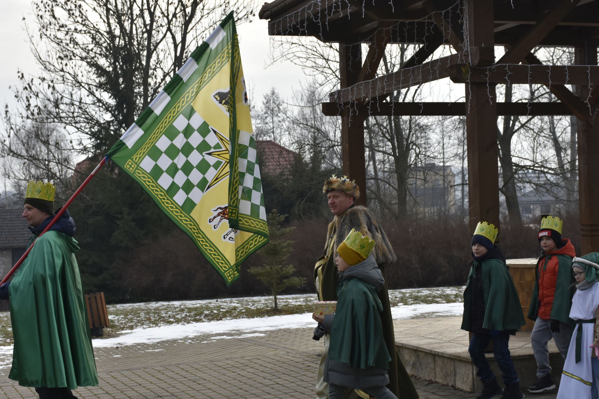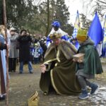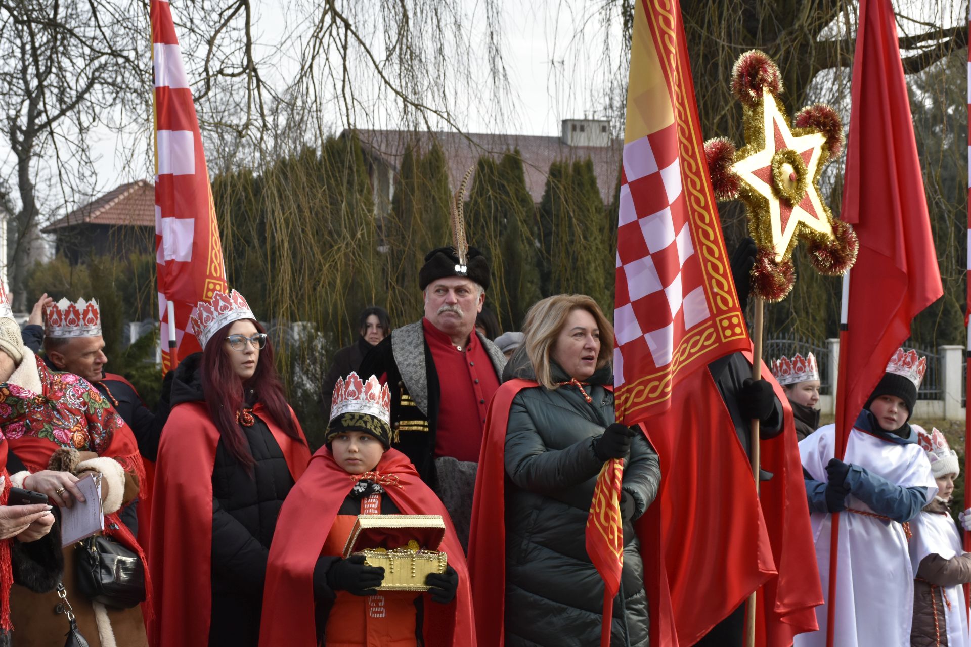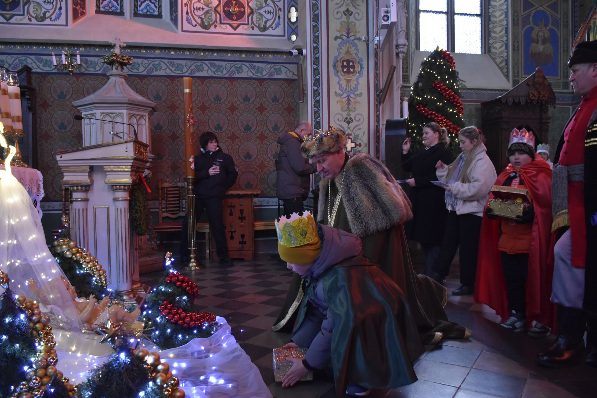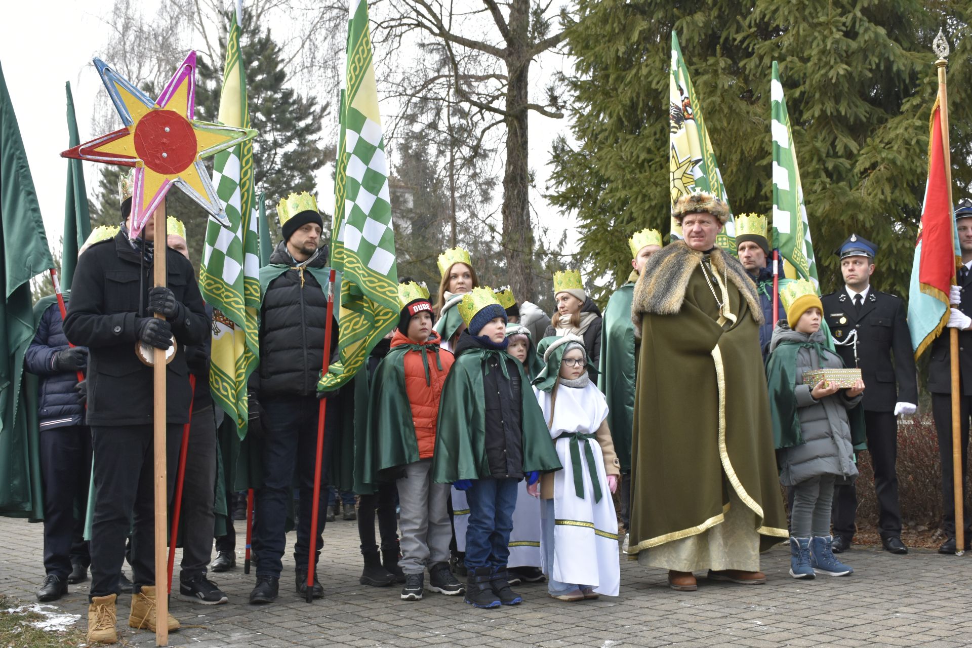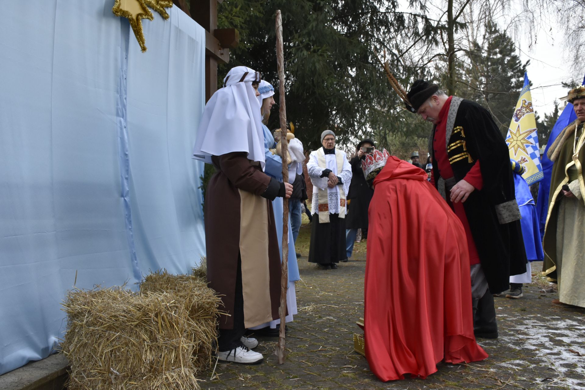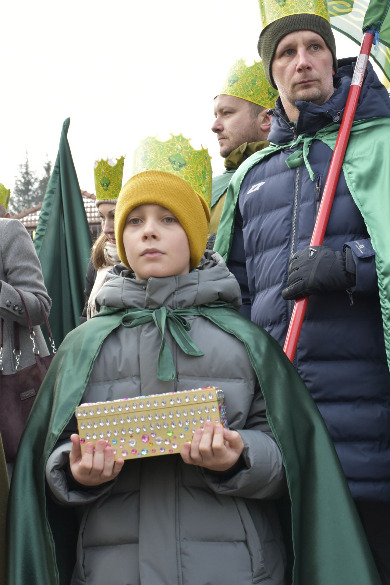 Trzy części Orszaku w trzech kolorach – niebieskim, czerwonym i zielonym spotkały się około godziny 11.00 na rynku przed kościołem, aby złożyć dary Dzieciątku w szopce, a następnie przejść do kościoła na Mszę Świętą o 11.15.