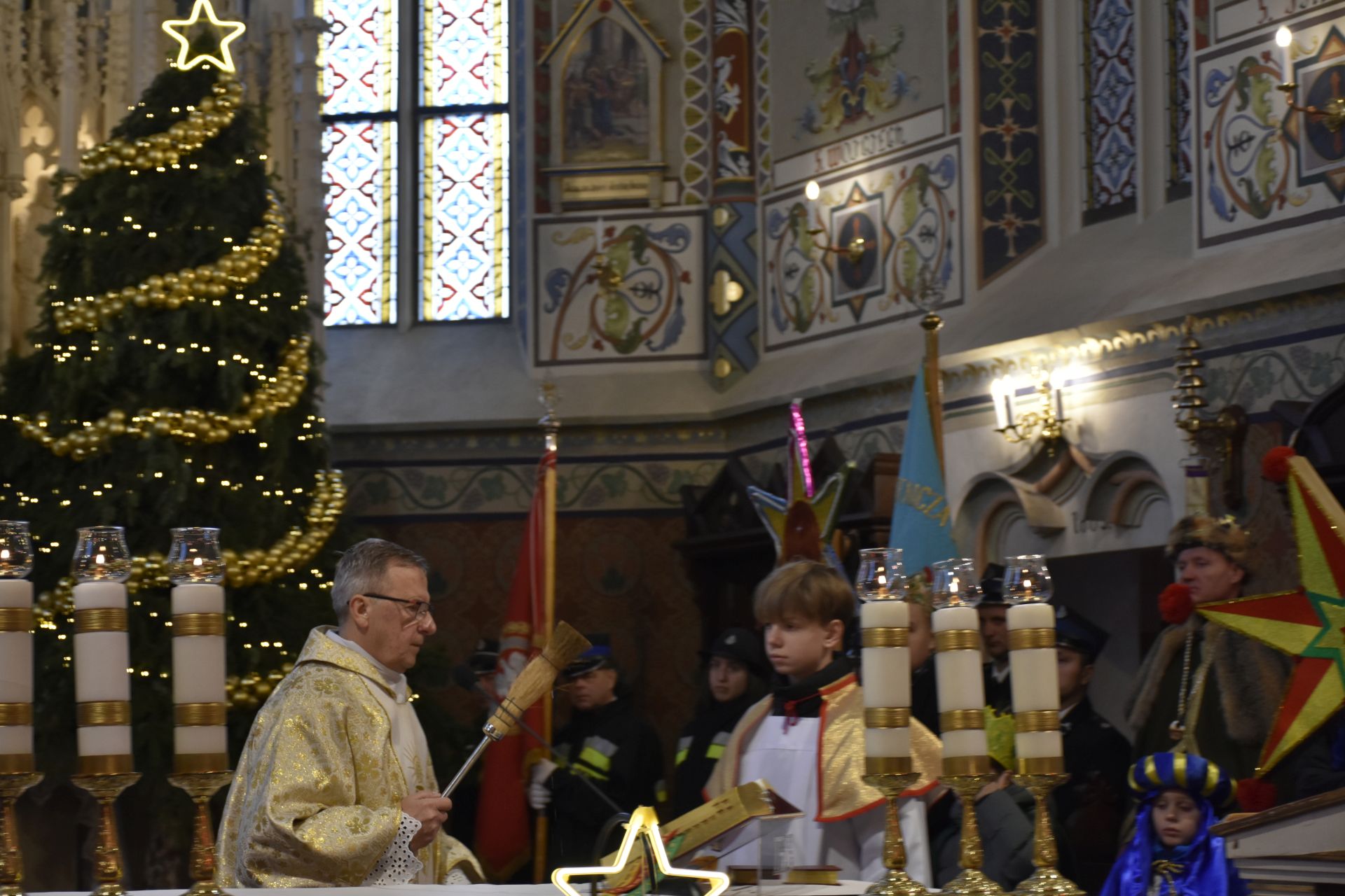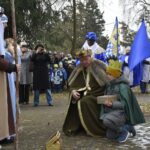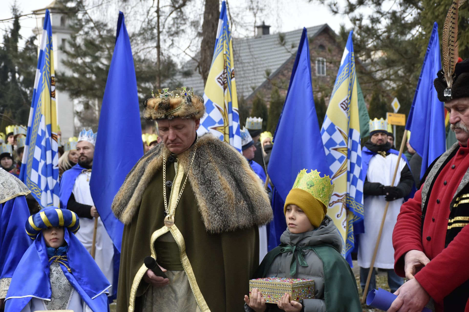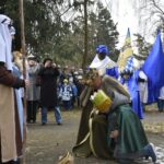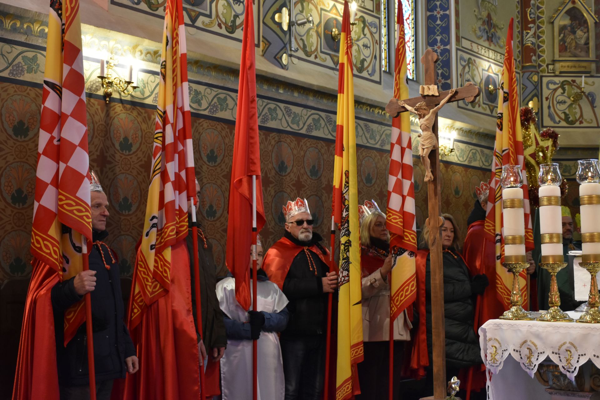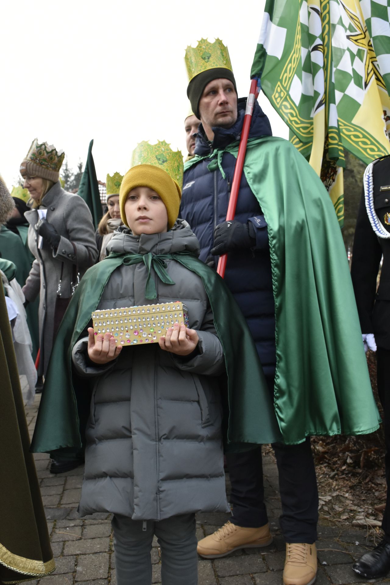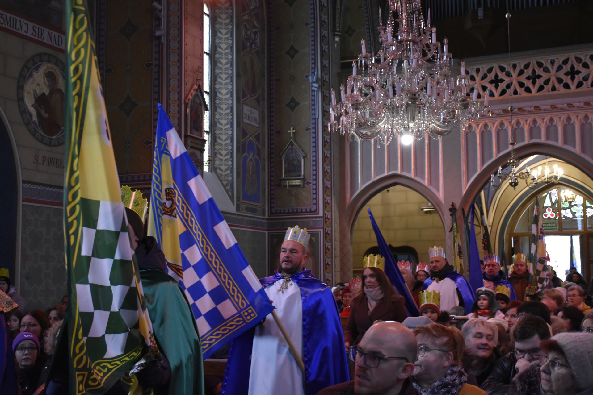 Trzy części Orszaku w trzech kolorach – niebieskim, czerwonym i zielonym spotkały się około godziny 11.00 na rynku przed kościołem, aby złożyć dary Dzieciątku w szopce, a następnie przejść do kościoła na Mszę Świętą o 11.15.