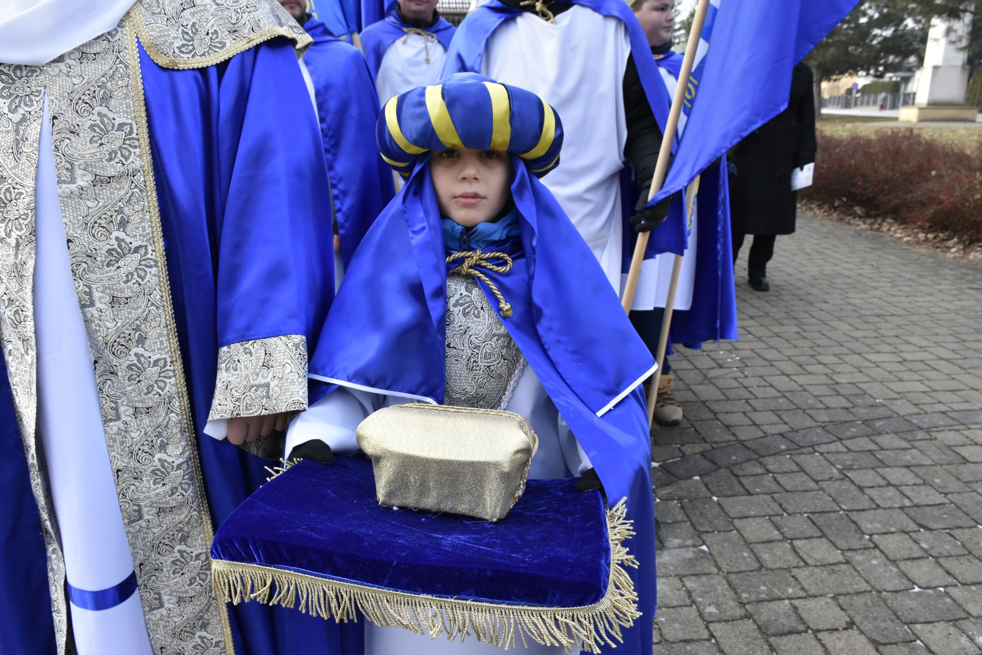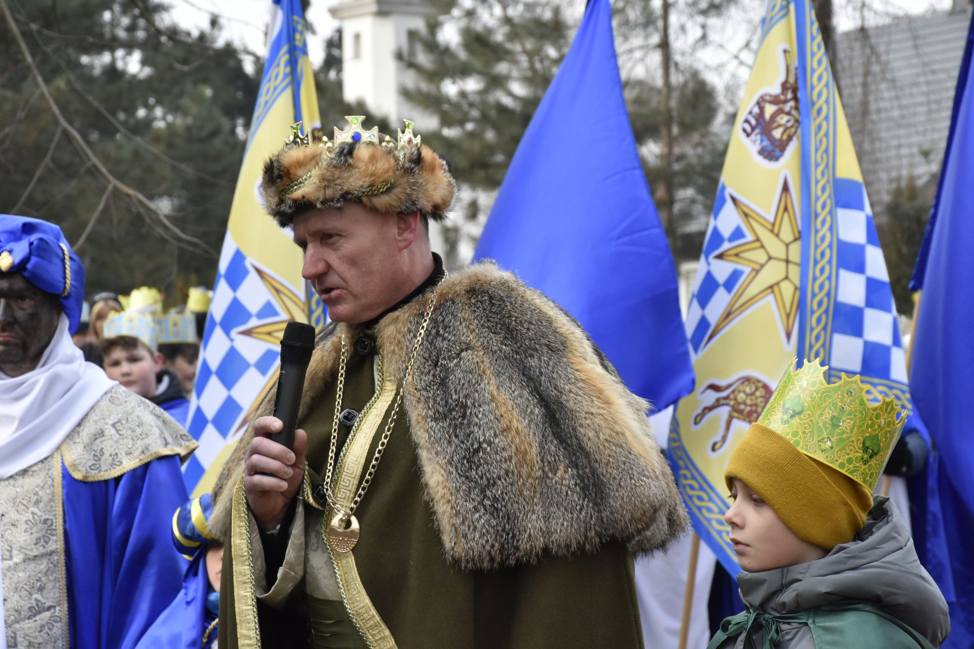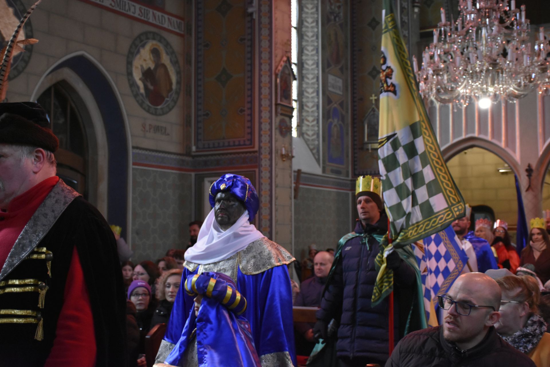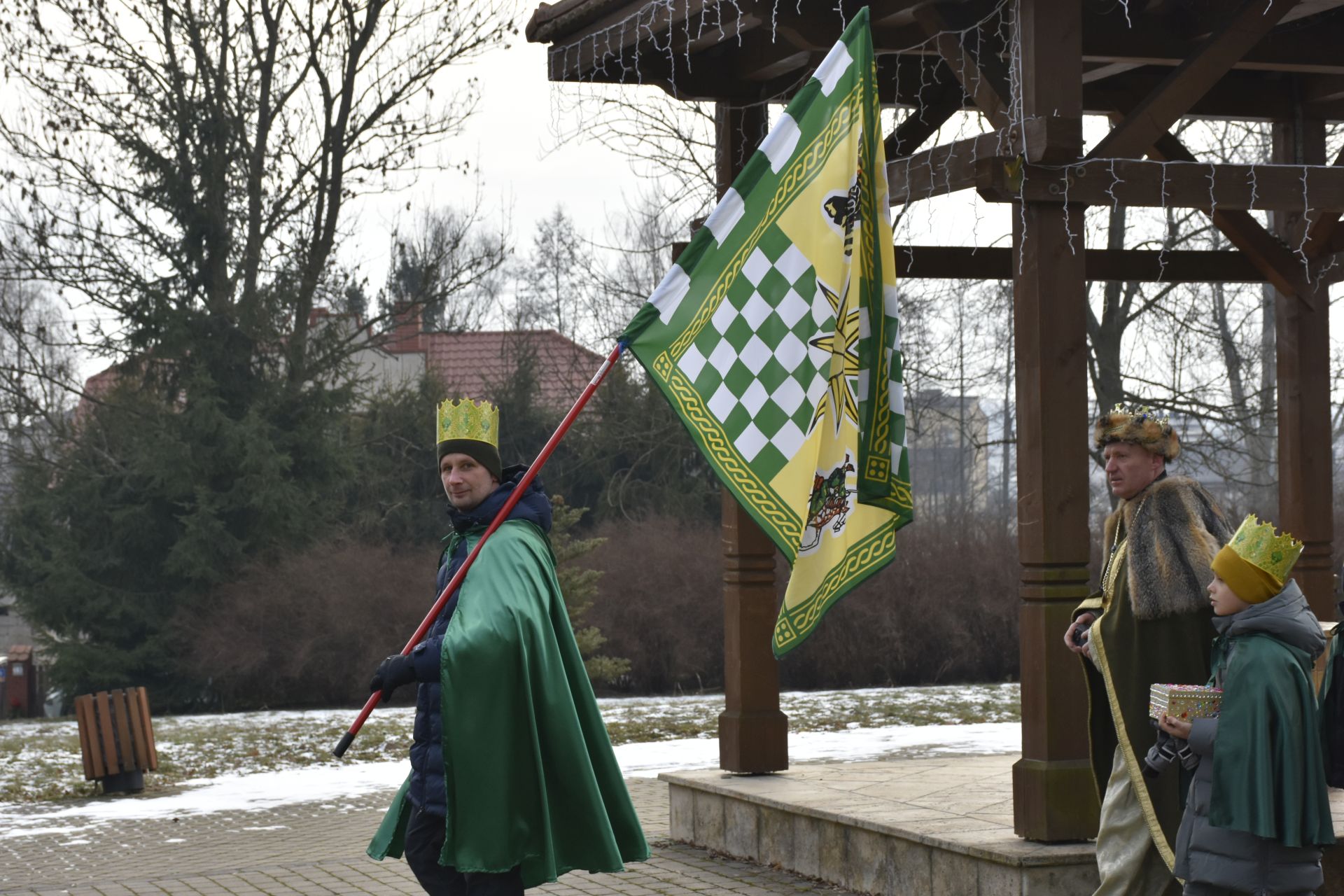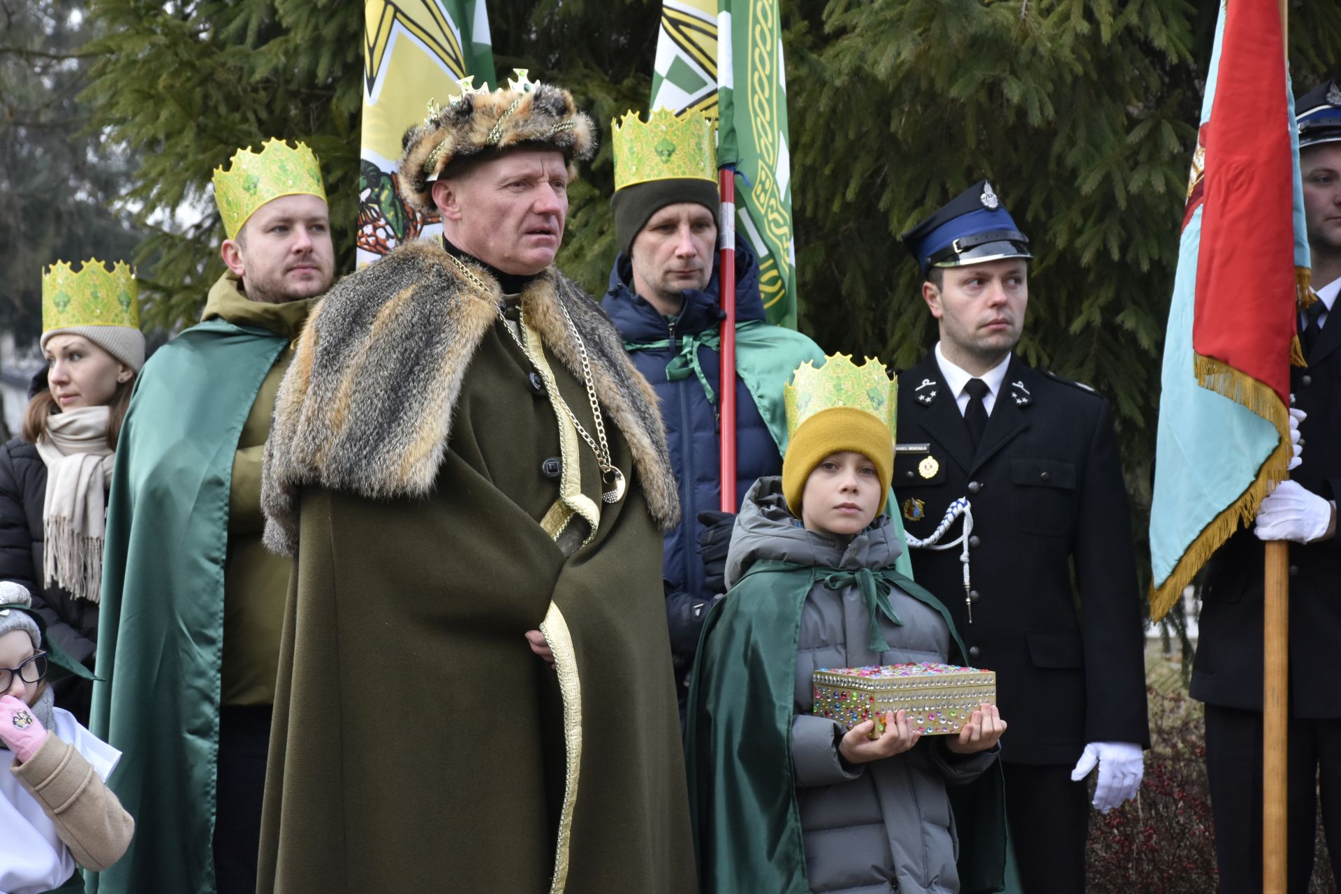 Trzy części Orszaku w trzech kolorach – niebieskim, czerwonym i zielonym spotkały się około godziny 11.00 na rynku przed kościołem, aby złożyć dary Dzieciątku w szopce, a następnie przejść do kościoła na Mszę Świętą o 11.15.