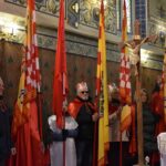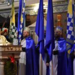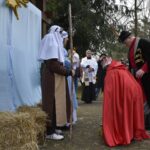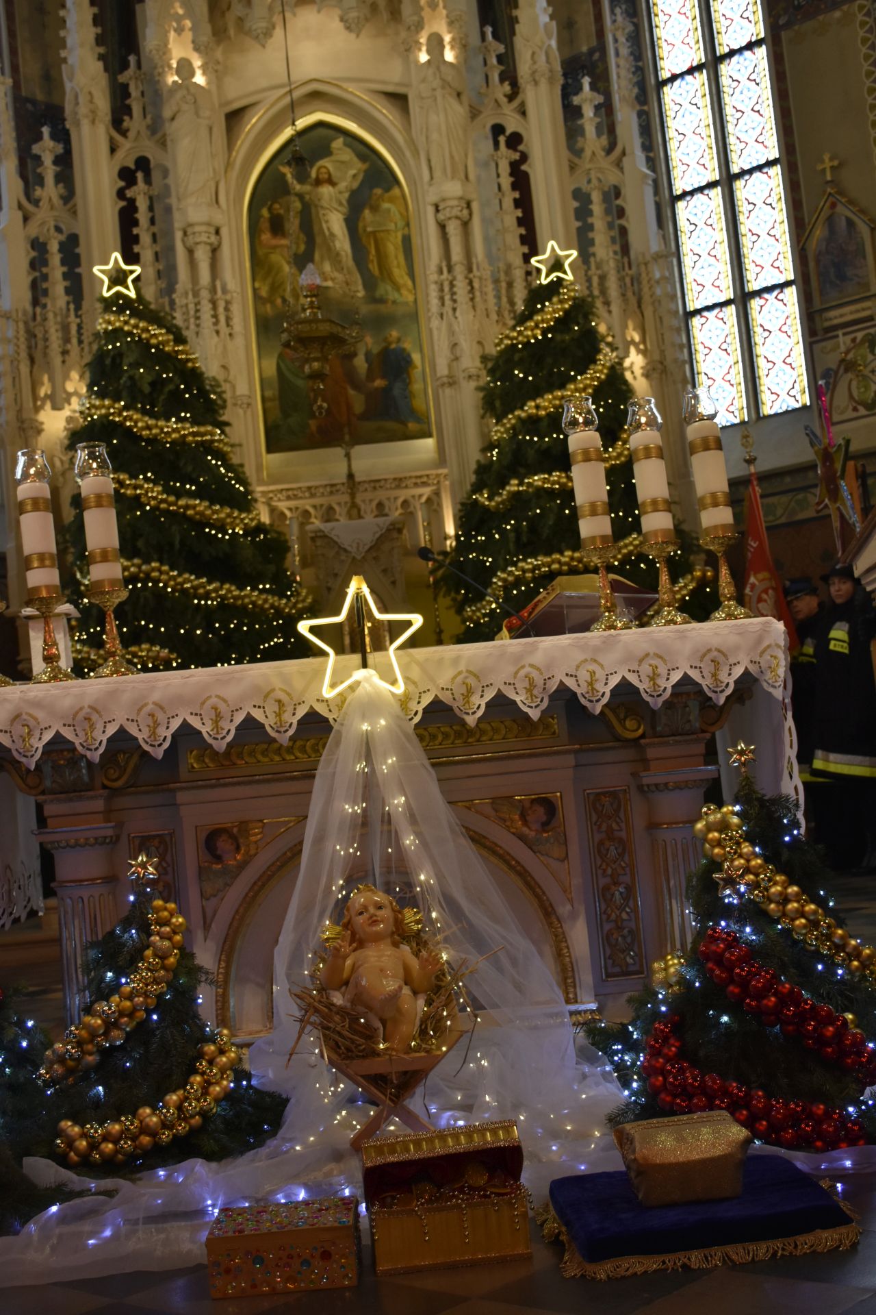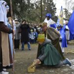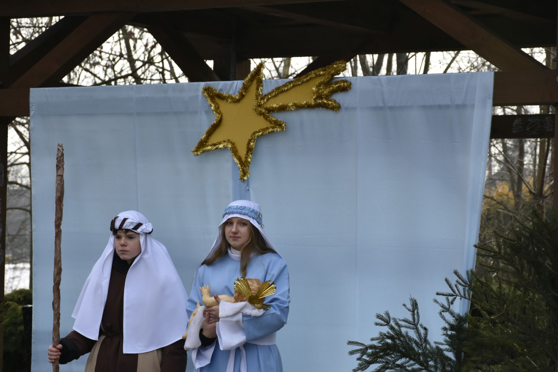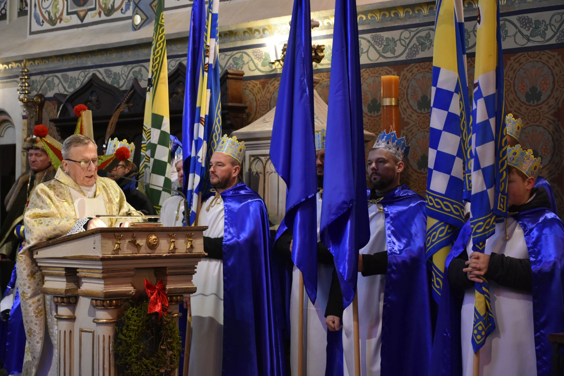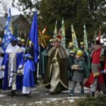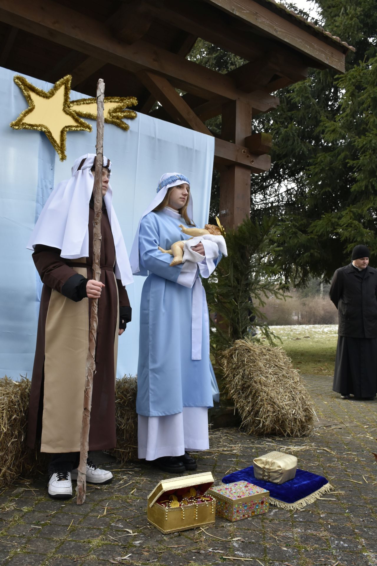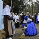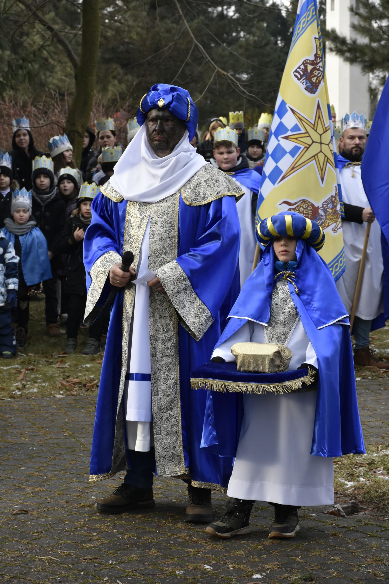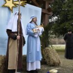 Trzy części Orszaku w trzech kolorach – niebieskim, czerwonym i zielonym spotkały się około godziny 11.00 na rynku przed kościołem, aby złożyć dary Dzieciątku w szopce, a następnie przejść do kościoła na Mszę Świętą o 11.15.