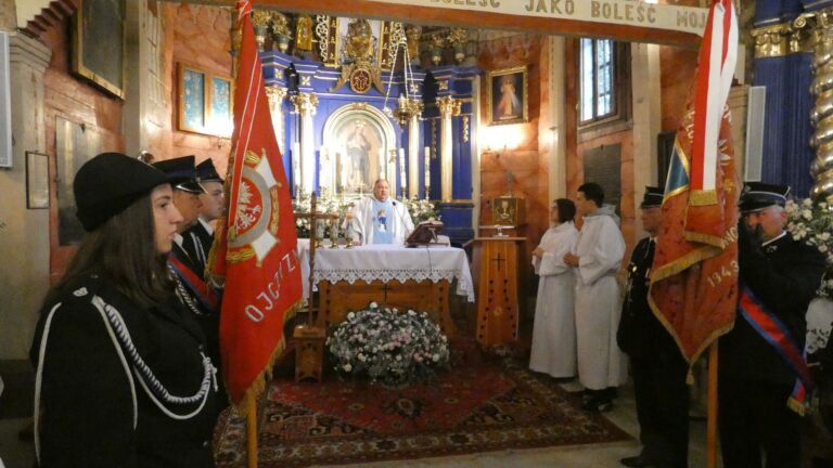 Boże Ciało 2025. Msza Święta o godzinie 9.30 rozpoczęła główne uroczystości Bożego Ciała w naszej parafii. Procesja Eucharystyczna do czterech ołtarzy ruszyła po zakończeniu mszy. Jak co roku na czele procesji szła służba liturgiczna i poczty sztandarowe strażaków OSP z terenu naszej parafii. Za pocztami sztandarowymi szły Młodzieżowe Drużyny OSP,