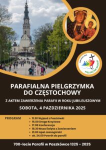Parafialna Pielgrzymka do Częstochowy z Aktem Zawierzenia naszej Parafii w Roku Jubileuszowym będzie w sobotę 4 października. Zapisy jeszcze do najbliższej soboty (20-10-2025) w zakrystii lub kancelarii parafialnej. Pojadą trzy autokary i jest jeszcze kilkanaście wolnych miejsc. PROGRAM: – 11.30 Wyjazd z parkingu przy kościele w Paszkówce – 15.00 Droga Krzyżowa – 17.00 Konferencja – 18.30 Msza św. z Zawierzeniem – 21.00 Apel Jasnogórski – ok. godz. 24.00 Powrót do parafii Koszt pielgrzymki 60 zł. Wpłacamy w autobusie.