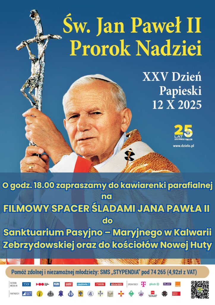 6. W ramach obchodów Dnia Papieskiego, w niedzielę 12 października o godz. 18.00, zapraszamy do kawiarenki parafialnej na filmowy spacer śladami św. Jana Pawła II: do Sanktuarium w Kalwarii Zebrzydowskiej i do Nowej Huty, gdzie poznamy historię zaangażowania ówczesnego biskupa Karola Wojtyły w powstanie nowych kościołów.