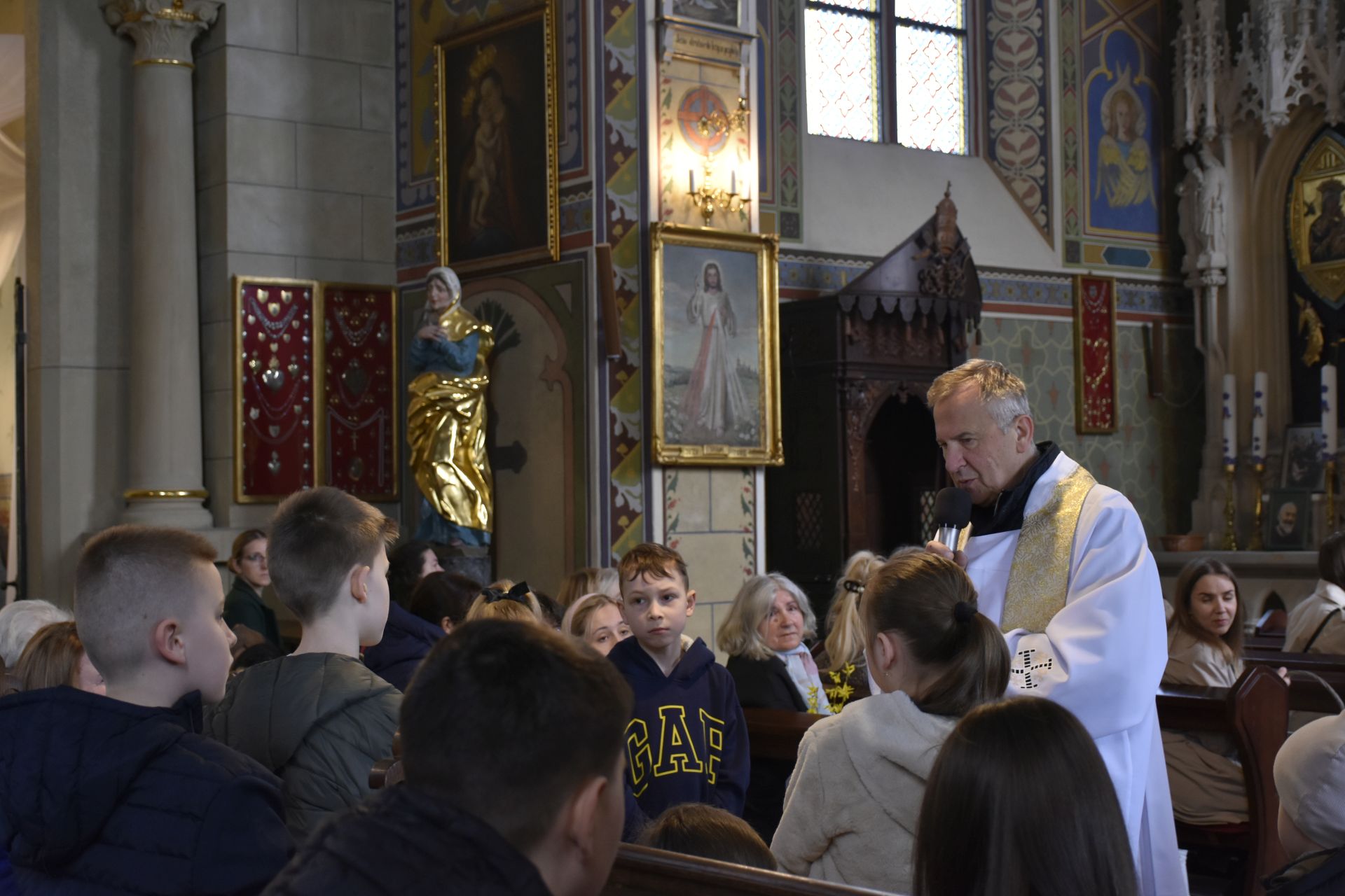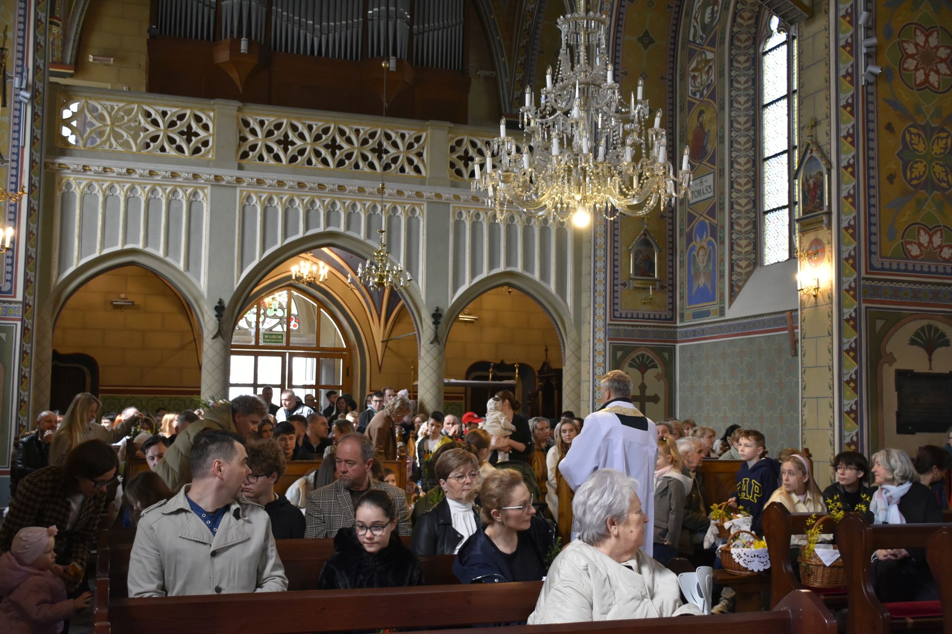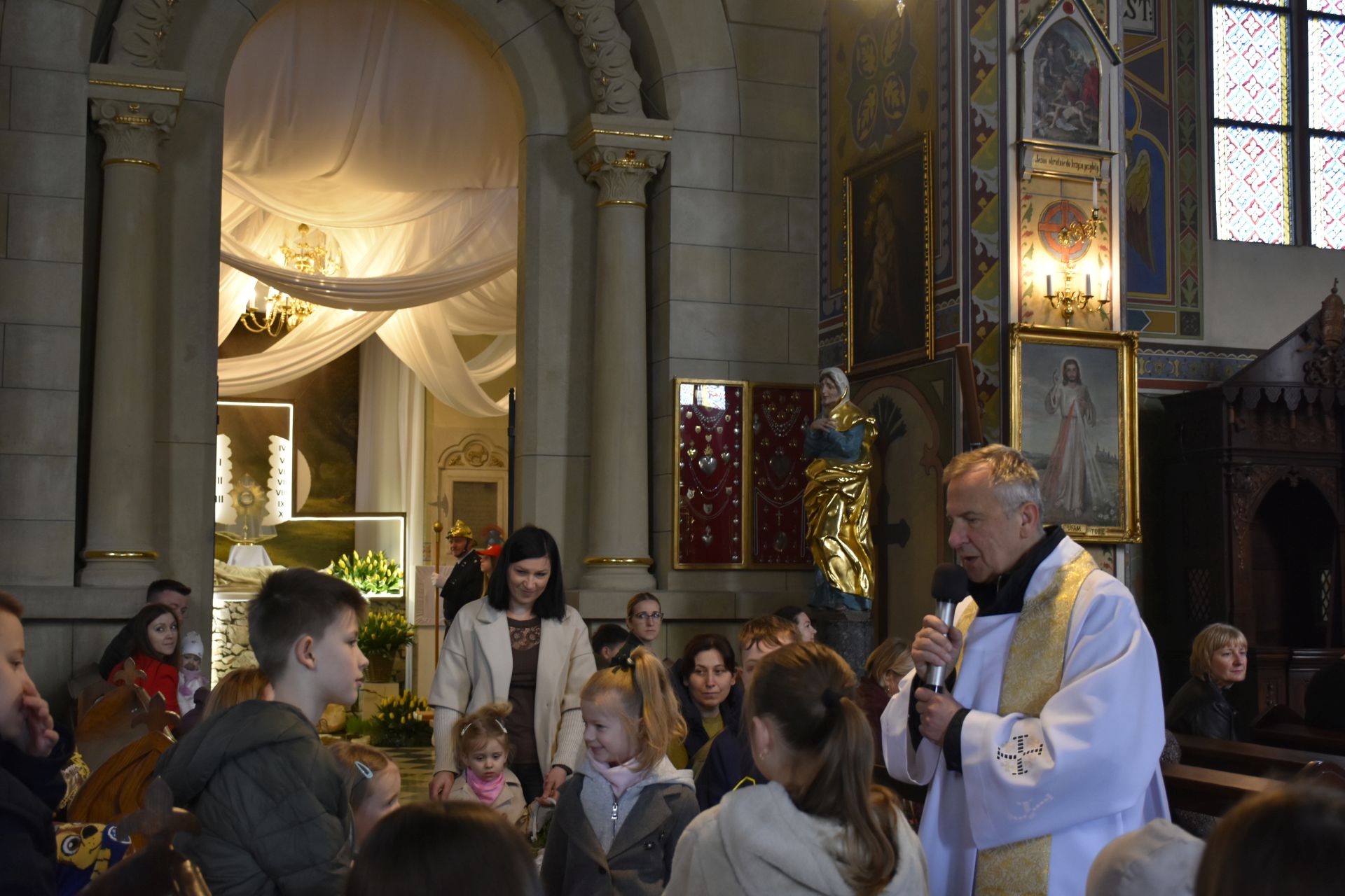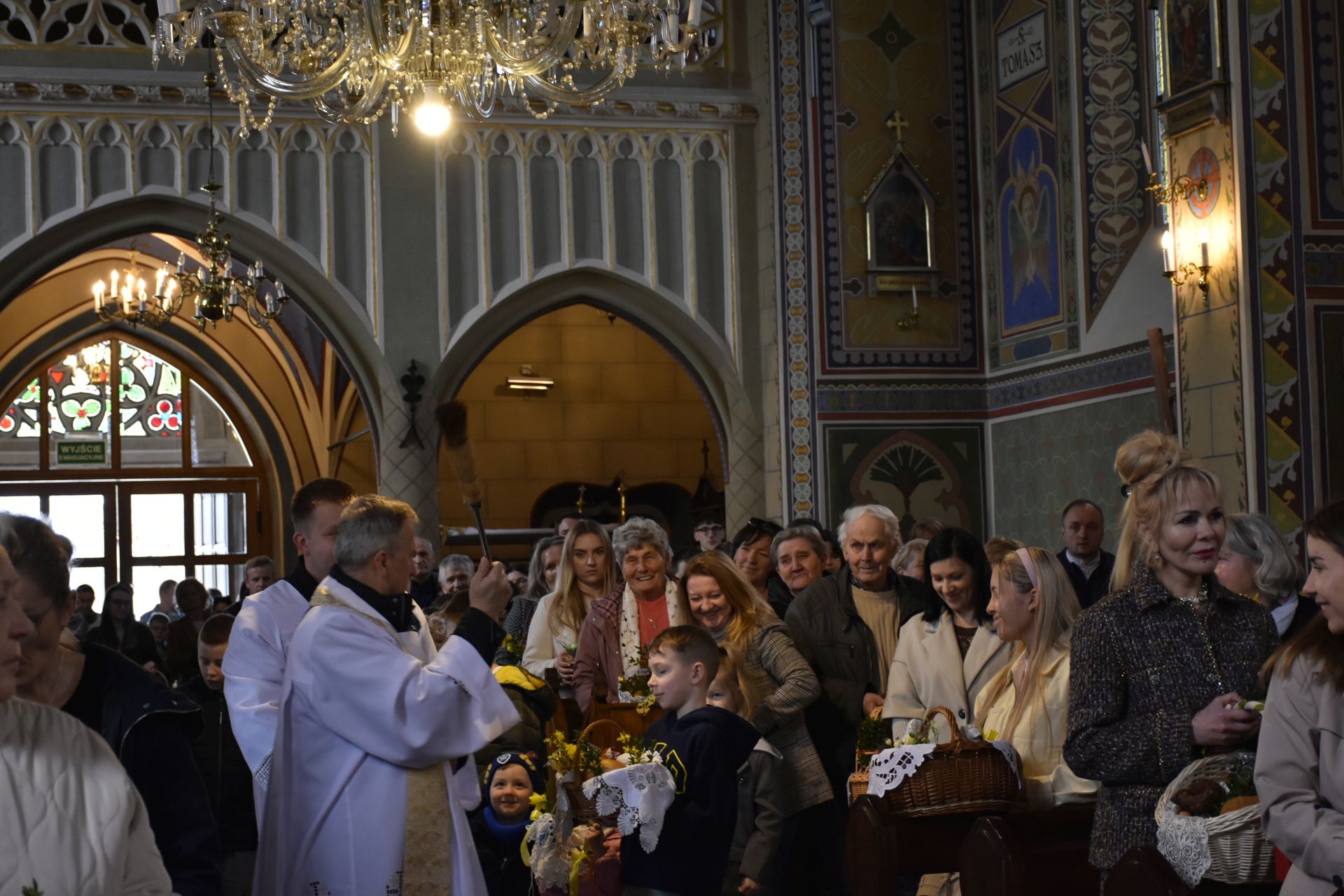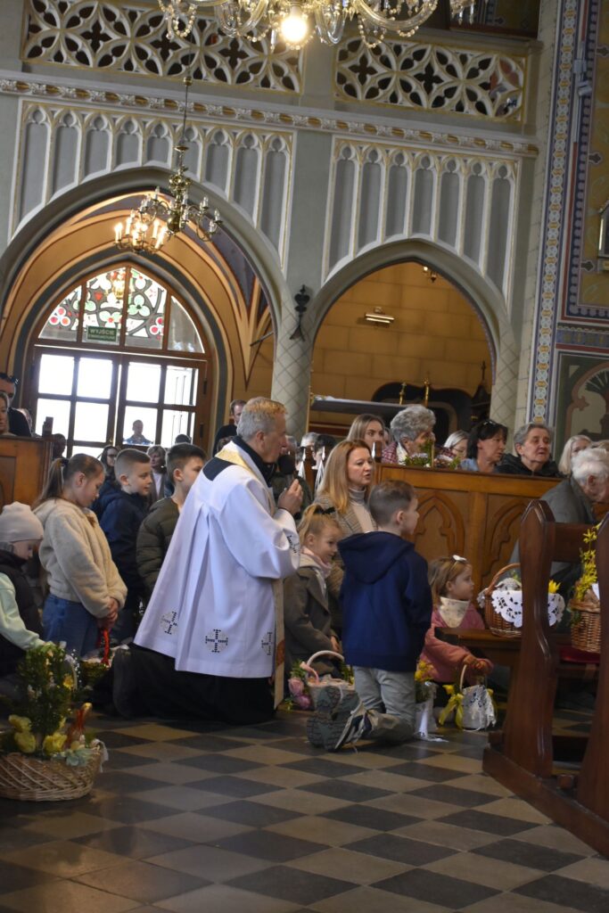 Nasza fotorelacja pochodzi z błogosławieństwo pokarmów na stół wielkanocny o godzinie 12.00. Obrzędom przewodniczył ksiądz proboszcz, który w wyjątkowy sposób zaangażował najmłodszych parafian, przybliżając im znaczenie symboli znajdujących się w wielkanocnych koszyczkach. Najbardziej poruszającym momentem spotkania była wspólna modlitwa – ksiądz proboszcz wraz z dziećmi klęknął przed Grobem Pańskim, by oddać pokłon Jezusowi. To radosne i pełne wiary spotkanie było dla wszystkich zgromadzonych pięknym przygotowaniem do nadchodzących Świąt Zmartwychwstania.